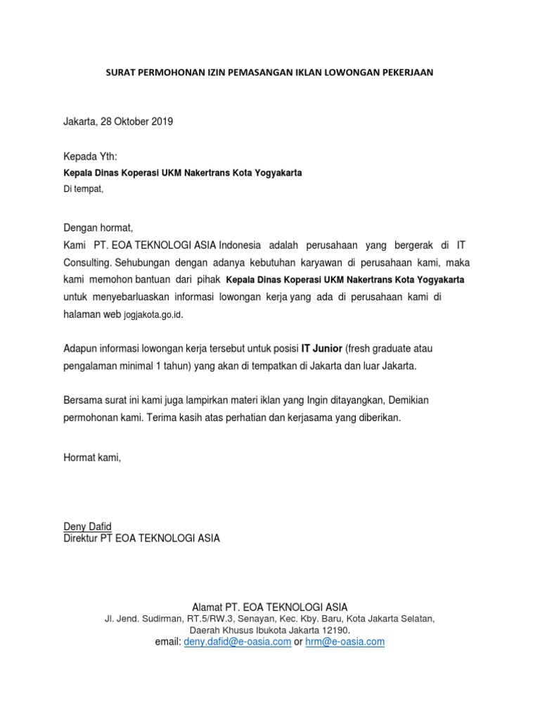 Surat Permohonan Izin Pemasangan Iklan Lowongan Pekerjaan Pdf